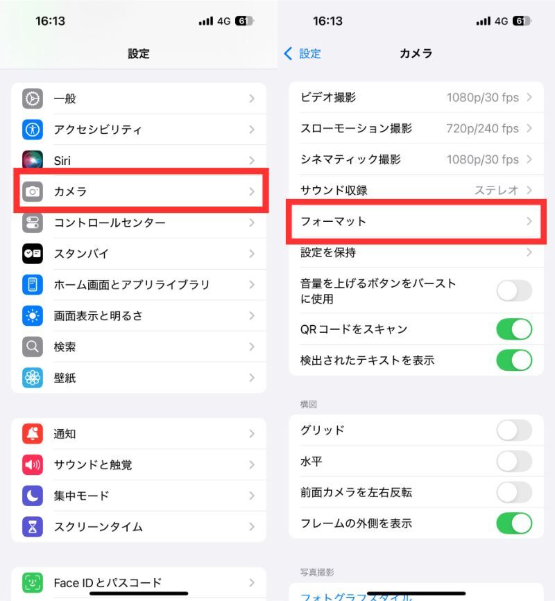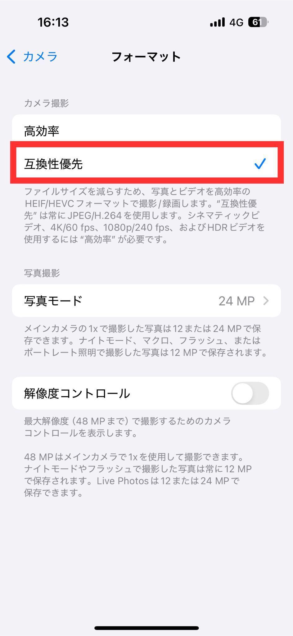iPhoneで撮影した写真がアップロードできないときは、画像ファイルの保存形式がHEIC形式になっていることが考えられます。下記の手順で設定変更を行った後、写真を撮影し直してください。